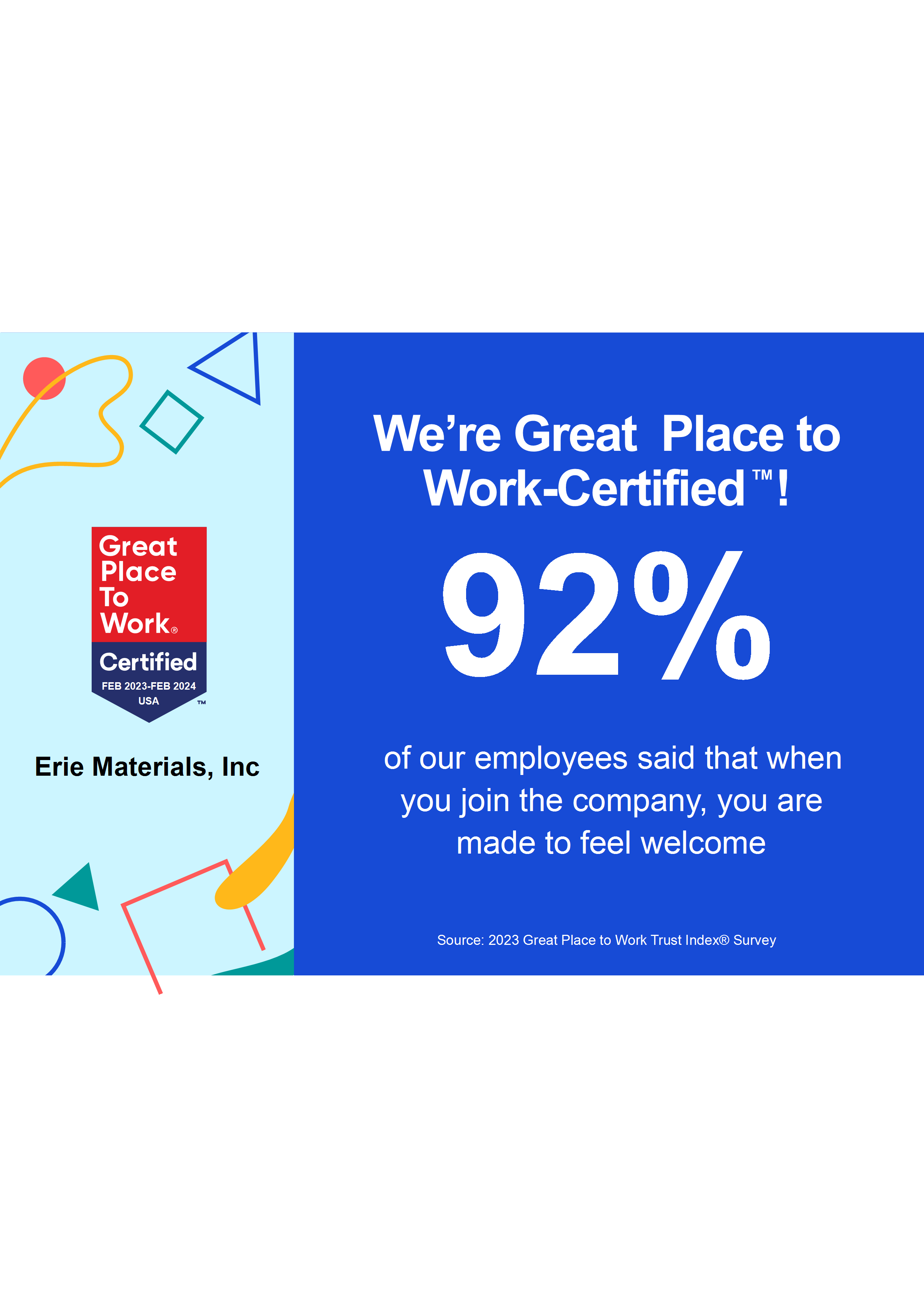 For the sixth consecutive year, Erie Materials has been designated a Great Place to Work-Certified company!